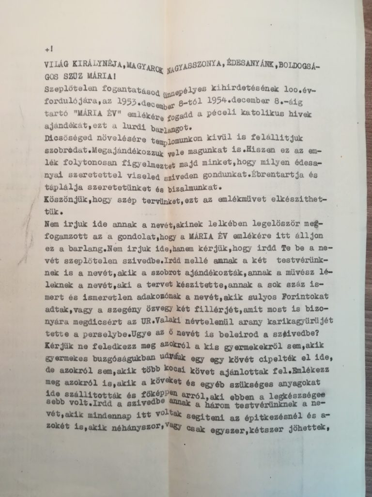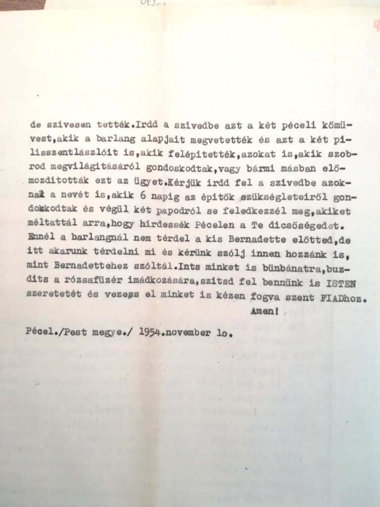 Az alábbi írásokat a Váci Püspöki és Káptalani Levéltárban fedeztem fel 2021-ben; azok a templomunk előtt álló Lourdes-i barlanghoz kapcsolódnak.(L.F.szerk)