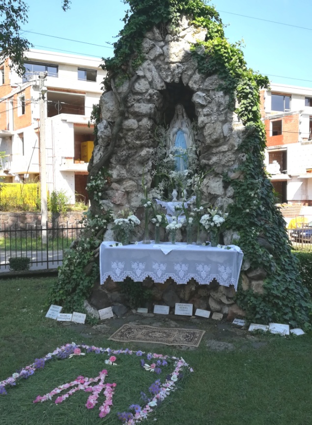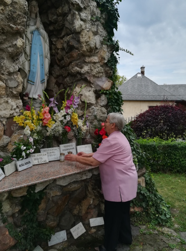 A nyár folyamán vasárnaponként szorgos kezek díszítik a Lourdes-i Szűz Mária szobrát a barlangnál.