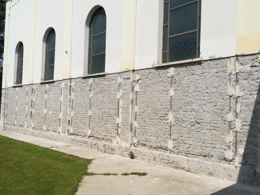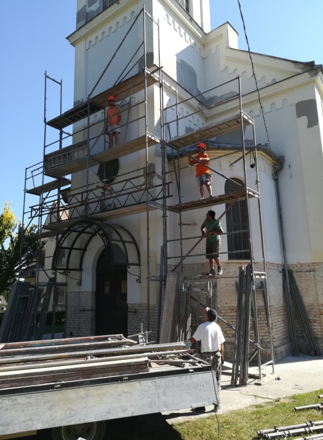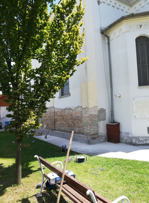 Június 25-én megkezdődött a templom javítása. De nem a leglátványosabb kiviteli munkákkal (állványozás, tetőbontás, stb.), hanem a vakolat alsó, javítandó részének leverésével. A vakolat eltávolítása után derül ki, hogy milyen minőségű (mennyire légáteresztő) habarccsal kell majd a javításokat (újravakolást ) elvégezni. A néhány fős brigád szép rendet hagyott maga után a munkaterületen. (L.F. szerk. felv.)