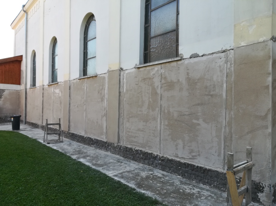 Az újra vakolt fal a templom sekrestye felőli oldalán