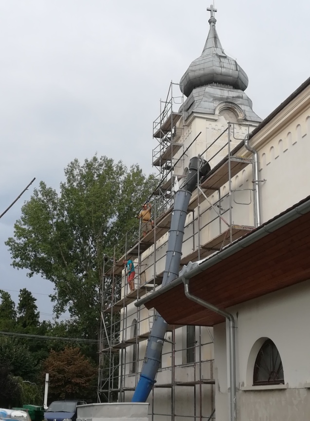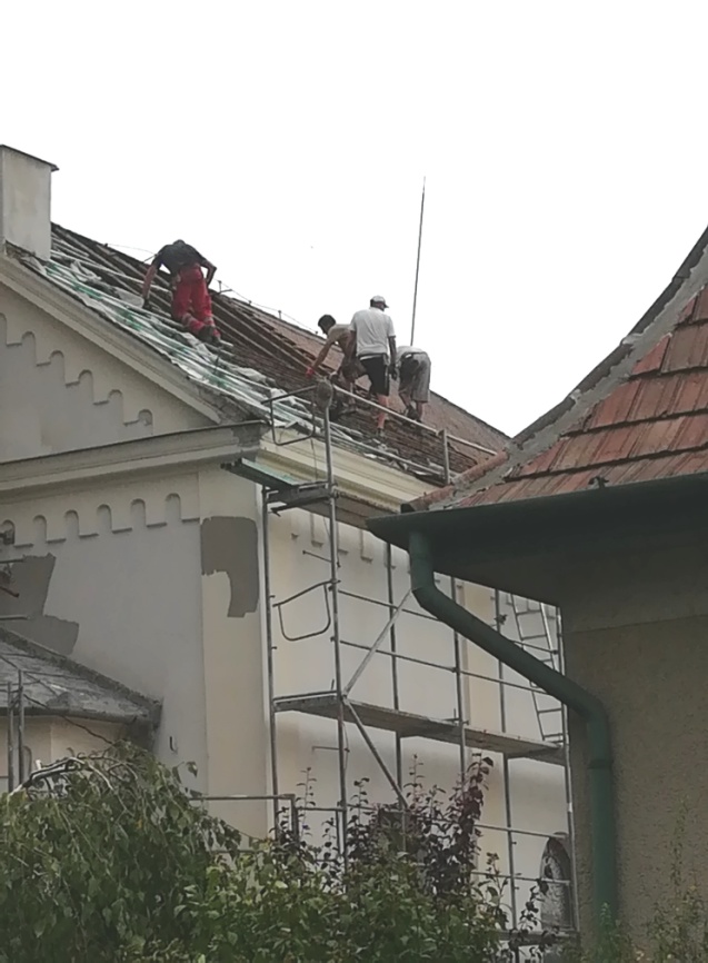 Augusztus 23-ra (amikor ez a felvétel készült) a külső tetőről (az apszis kivételével) lekerült az összes pala, kicserélték a szükséges mértékben a tetőanyagot, védőfólia került az egész tetőzetre. Megkezdődött a bádogozási munka, majd ezt követi a pala alá történő lécezés. „Alul” sem pihentek, mert a templom déli oldalán kész lett a vakolás a teljes mértékig, és ez folytatódik a templom elején és a plébánia felőli oldalon. Ezt a réteget még további réteg felvitele követi majd és utána kerül sor a színezésre.