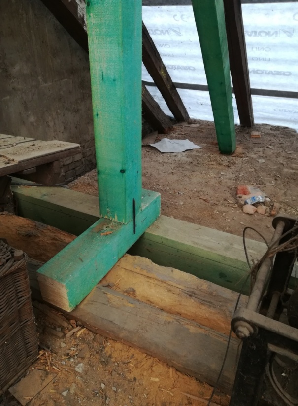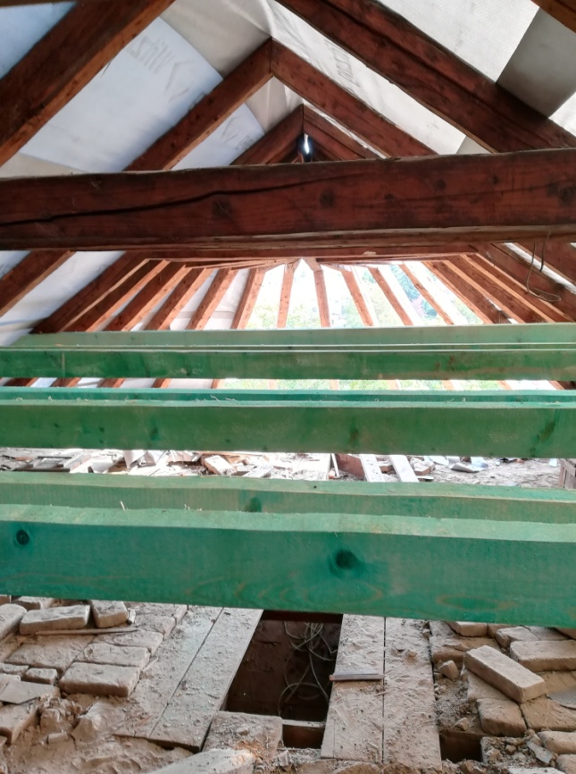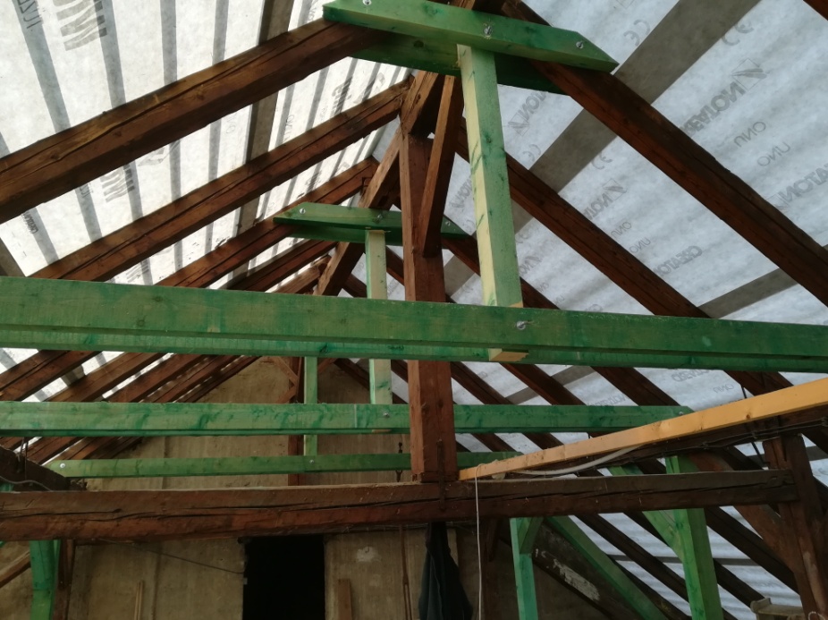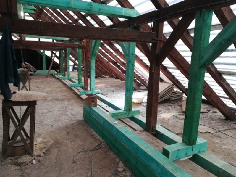A templom tatarozása kapcsán folytatódtak a dolgos hétköznapok. Néhány kép a tető belsejének helyreállításáról (ahogy az olvasók általában soha nem látják). A zöld színű részek az újonnan beépített szerkezeti elemek.