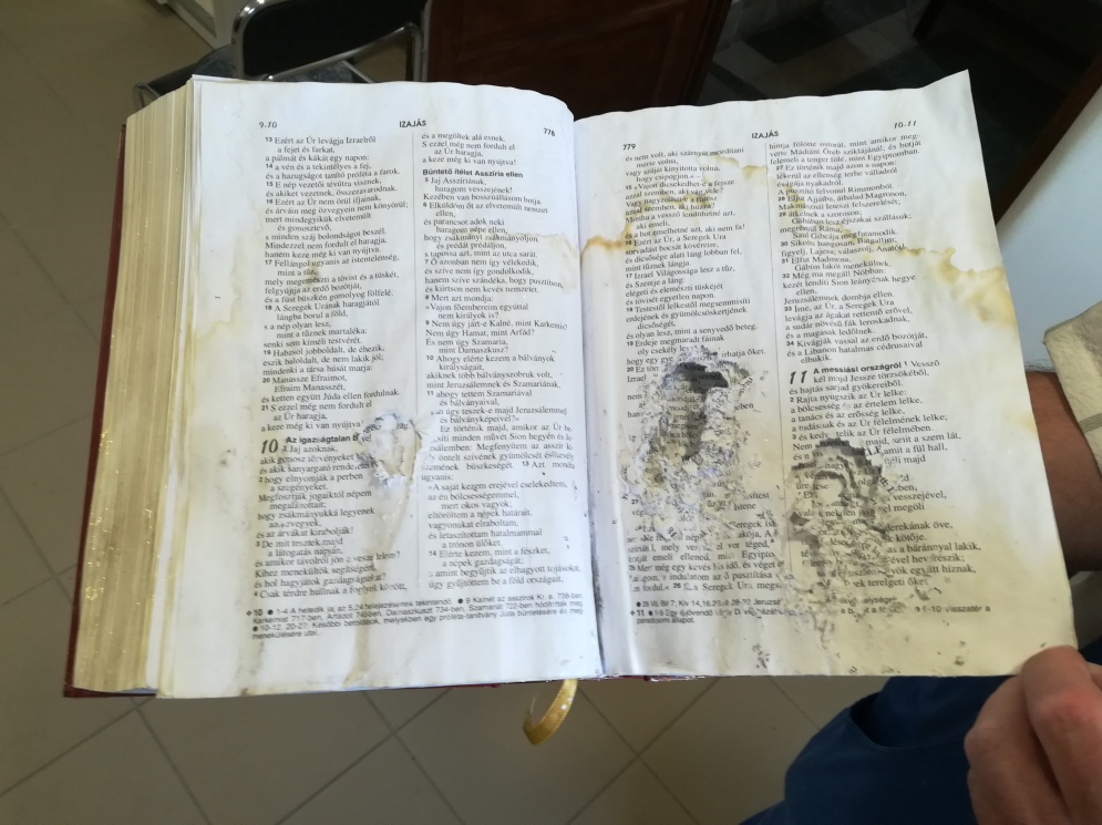 Megszületett a veszteséglista első darabja is. A héten volt nagy esőzések miatt a szentély sarka felett a tető beázott és a becsurgó eső a tartón elhelyezett Szentírás lapjait teljesen átlyukasztotta.