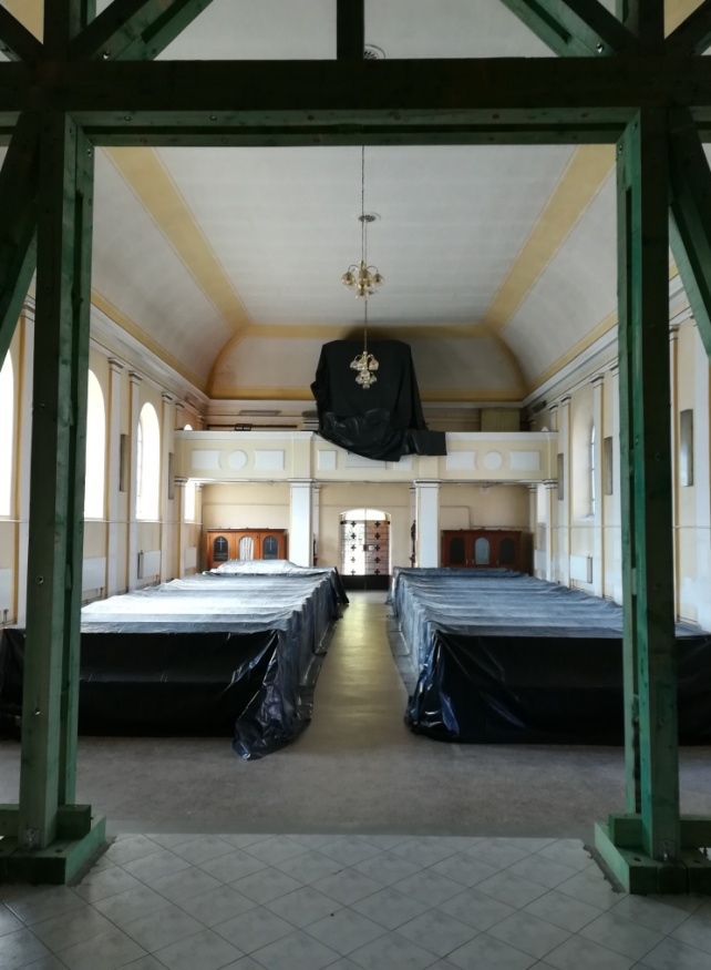 Szeptember 10-én ismét „használaton kívül helyeztük” a templomot. ennek oka, hogy a szentély előtti – jelenleg aládúcolt – boltívet a mesterek megbontják, a további munkák előkészítése végett. A munkák sok porral járnak így a templomot le kellett takarni és a mozdítható dolgokat kivinni. Emiatt – egyelőre egy hétig – a hittanteremben lesznek a misék. Úgyhogy a takarási munkák elején a terem berendezéséről kellett gondoskodni. Az új helyzet a mellékelt képen látható.