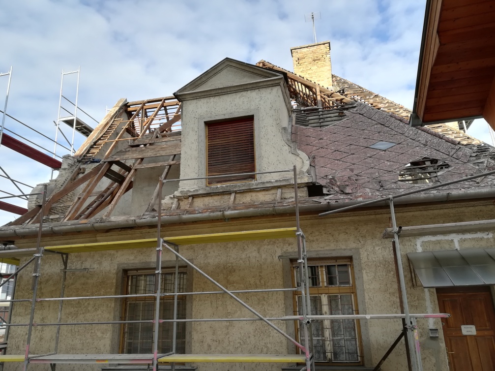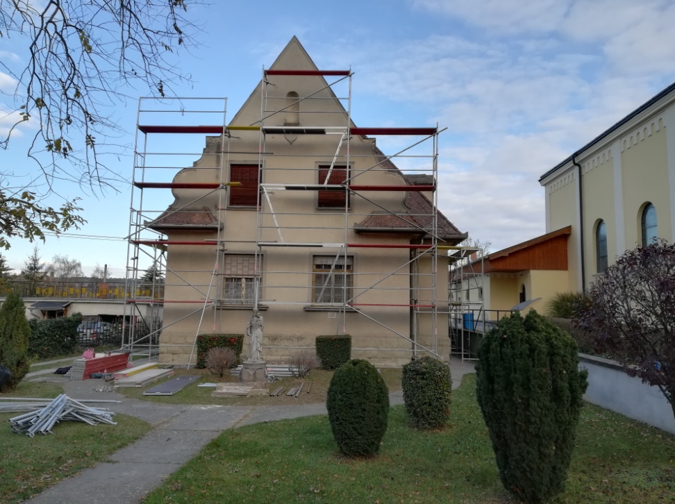 November 14-én a szakemberek elkezdték a plébánia körbe-állványozását a tetőszerkezet javítása (cseréje?) céljából. Nem csoda: 1931., a megépítés éve óta bőven ráfér már a generálozás…