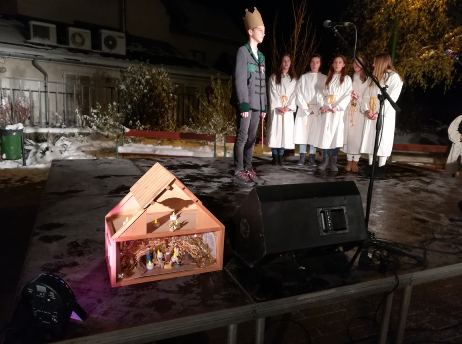A műsor után a téren polgármester úr meggyújtotta a harmadik gyertyát, miközben a jelenlévők közösen elénekelték a Mennyből az angyal-t. A közös ének után a katolikus iskola 7. osztályos tanulói egy nagyszalontai betlehemest adtak elő.