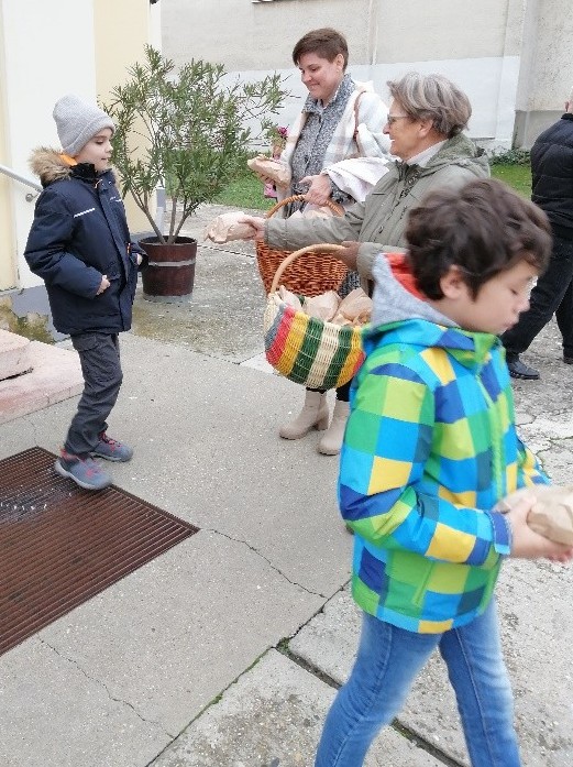 A szentmise végén László atya megáldotta a Karitász csoport által hozott kalácsokat, és ezeket a csoport tagjai a templom előtt osztották ki a híveknek.