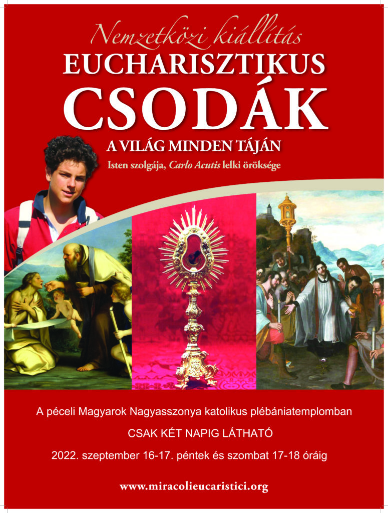 Szeptember 23-án és 24-én, pénteken és szombaton az esti szentmise előtt és után megtekinthető lesz a Carlo által összeállított eucharisztikus csodákról szóló kiállítás egy része.