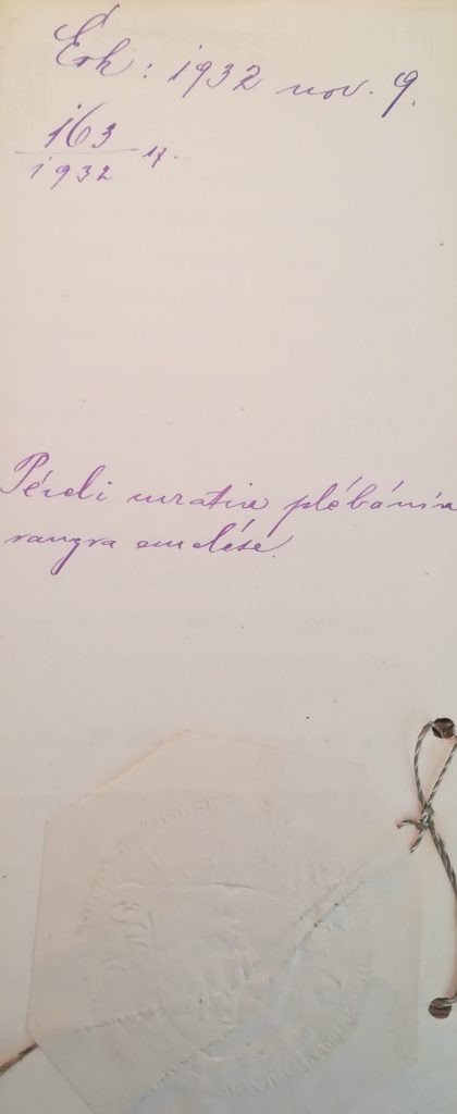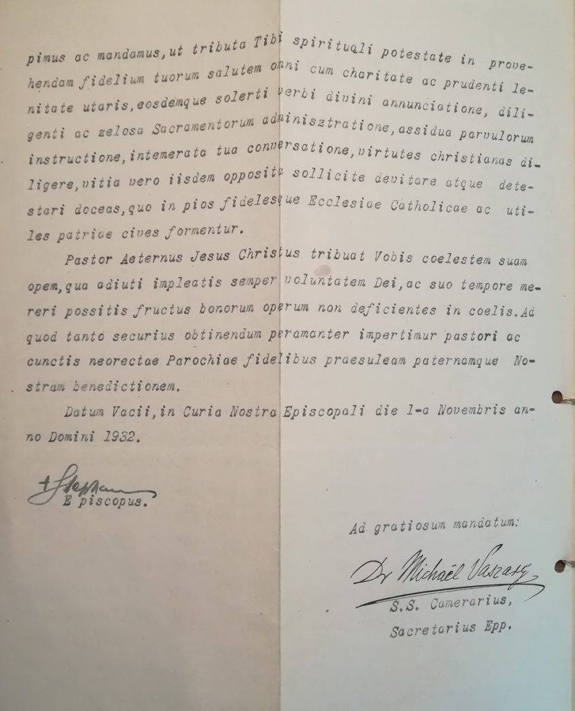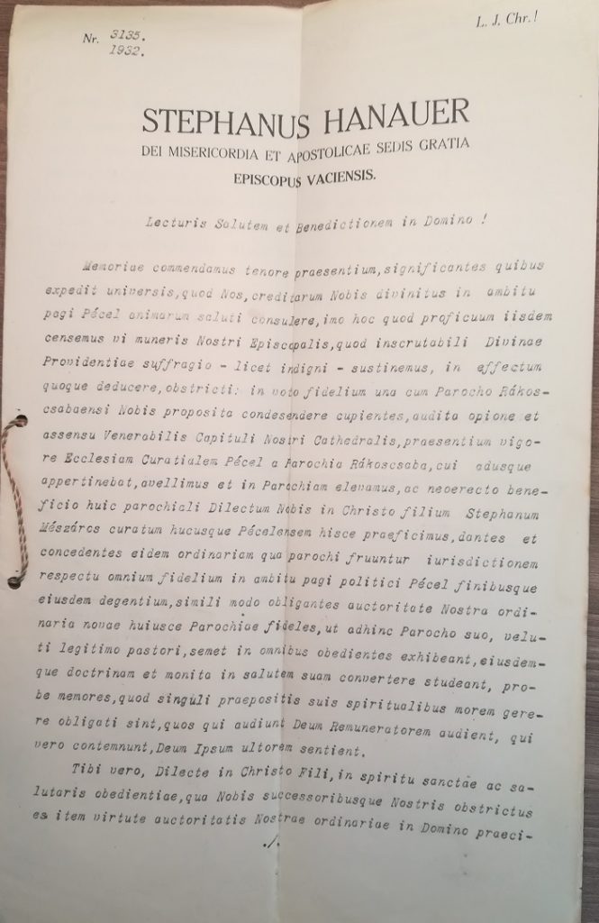 Nov. 9-én érkezett a váczi egyházmegyei hatóság leirata 3135/1932. sz. alatt, mely a péceli eddigi curatiát plébánia rangra emeli. Az okmány az irattárban 163/1932.sz. a. fellelhető.