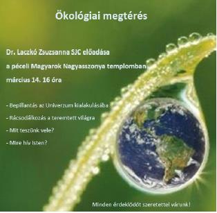 Ezzel azonosulva március 14-én 16 órától teremtésvédelemmel kapcsolatos lelki programra invitálunk mindenkit a templomba.Dr. Laczkó Zsuzsanna SJC előadása kapcsán elmélyedhetünk az Univerzum kialakulásában, rácsodálkozhatunk a teremtett világ szépségeire, és elgondolkodhatunk azon, Isten mire hív minket a jelen helyzetben.