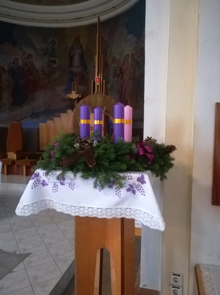 November 29-én ünnepeltük advent első vasárnapját. Előző este – a szombati elővételi szentmisén – meggyújtották az első adventi gyertyát. Megsokasodtak az adventhez kötődő  gondolatok, illetve  – a ferences atyák jóvoltából – megjelent az adventi kalendárium, amely a napi olvasmányok mellett  a napi elmélkedési témákat és az azokhoz kapcsolódó gyakorlati kérdéseket/megfontolásokat tartalmazza. Azok számára, akik az internetet nem használják – elsősorban az idősebb generáció – a kalendáriumból néhány példány kinyomtatott formában is elkészült és a templomi kisasztalon elérhetővé vált.