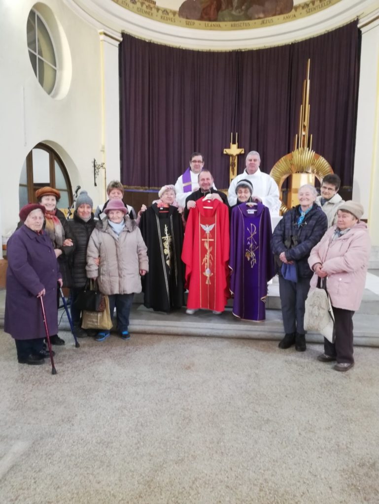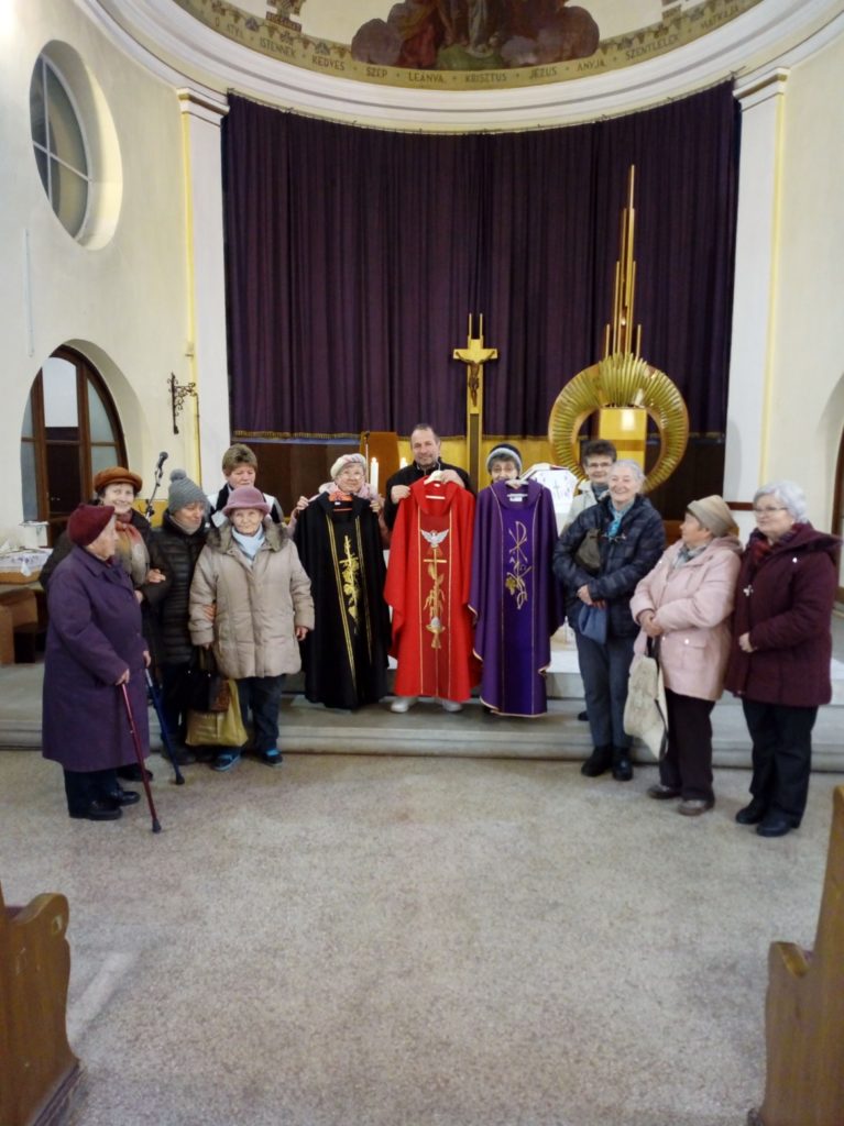 Külön öröm is érte az egyházközséget (és a templomot) a Rózsafüzér Társulat tagjai jóvoltából, akik három új miseruhával (piros, zöld és fekete) gazdagították a templom ruhatárát. Az alábbi képek ebből az alkalomból készültek.
