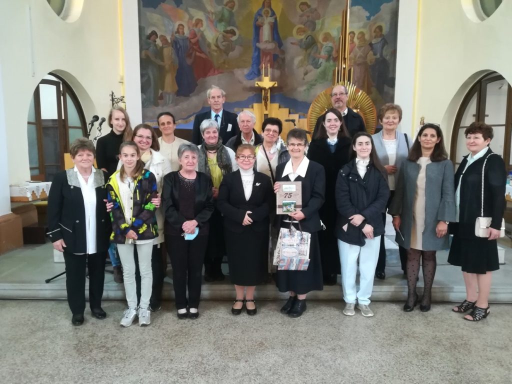 A könyveket végül is Kurczina Terézia SJC nővér vette át. (Egyáltalán nem mellesleg ő volt az egyike azoknak, akik a kötetet  sajtó alá rendezték.)   Az átadásról néhány képet mellékelek. Sajnos nem mindenki maradt ott, ezért  nincs minden kórustag a képeken.