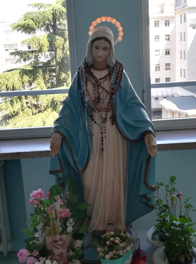 ( A felvétel a római S. Giovanni in Laterano kórház folyosóján készült 2019. júliusában, és jól mutatja az olaszok hallatlan Madonna-tiszteletét.  Saját felvétel)